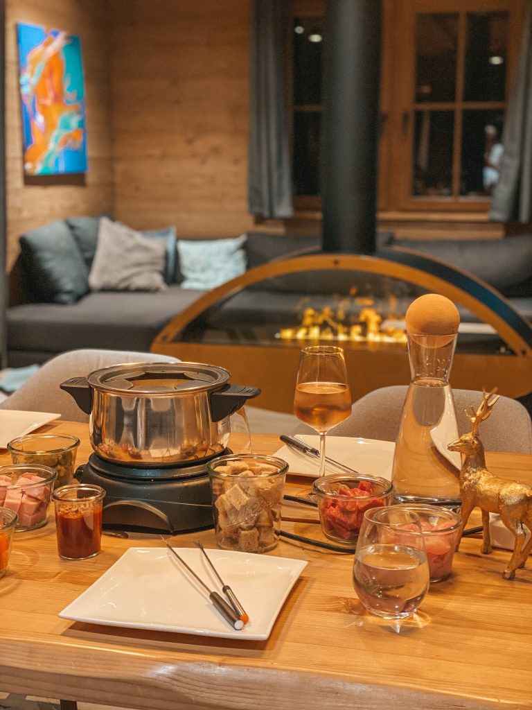 Am zweiten Abend sind wir in den Genuss des Fondues im eigenen Chalet gekommen. Es gibt verschiedene Fleisch- oder Fischsorten, diverse Saucen, mediterranes Gemüse & Gebäck oder ein tolles Käsefondue. Wir haben etwas von allem probiert und uns ins Chalet bringen lassen. Das Fondue ist super schnell und einfach aufgebaut und einem geselligen Abend steht dann nichts mehr im Wege! So kommt richtige Hüttenstimmung auf! 🙂