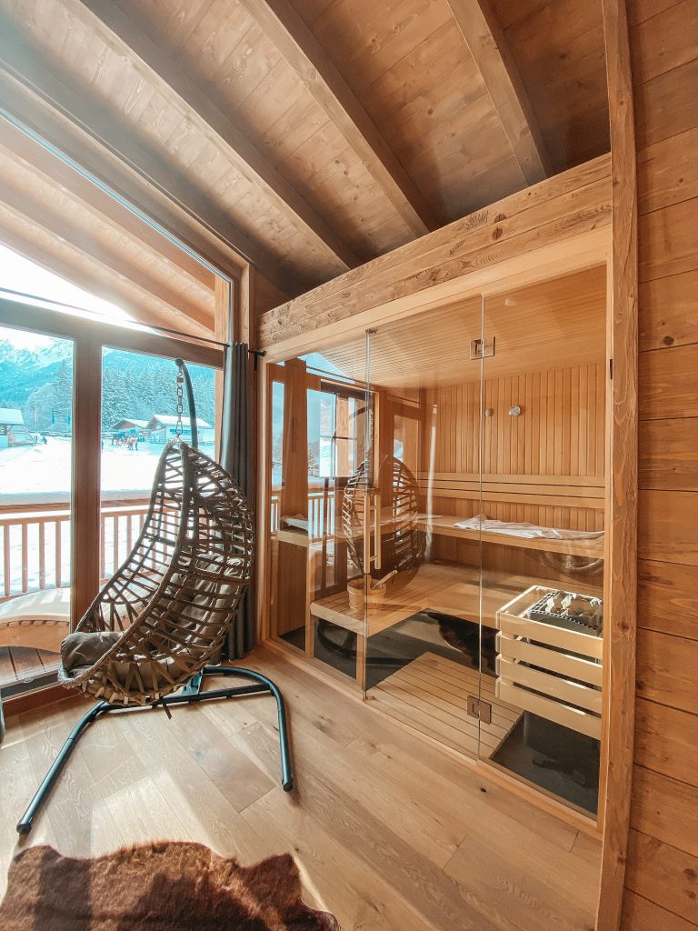 Zum Aufwärmen geht es nach einem langen Tag im Schnee in die hauseigene Sauna! Jedes einzelne Chalet besitzt seine eigene Sauna, sodass man hier völlig ungestört entspannen und wellnessen kann. Ich persönlich mag es nicht gerne, wenn die Saunen prall gefüllt sind und man sich nicht angenehm hinlegen kann. Neben der Sauna gab es in unserem Berggoldchalet auch Infrarotpanele, die nach einem langen Aufenthalt in der Kälte besonders wohltuend wirken.