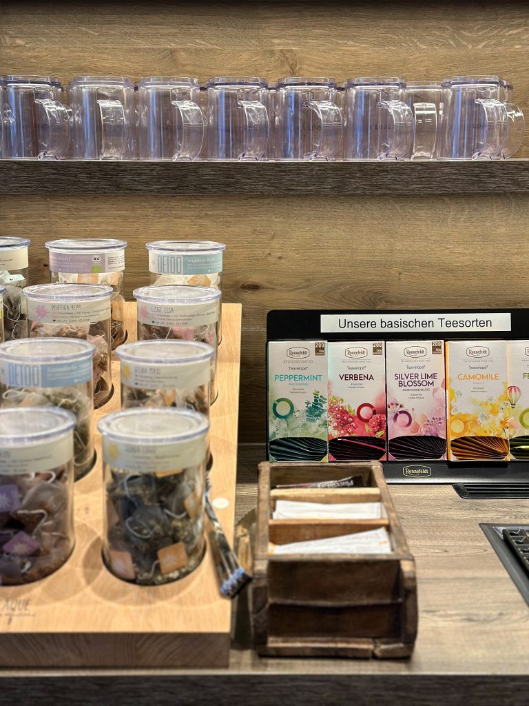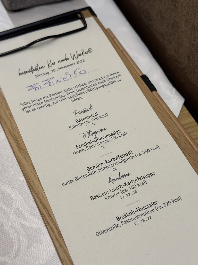 Es gibt jeden Tag zwei Mahlzeiten; mittags und abends bestehen diese aus zwei Gängen. Insgesamt nimmt man ca. 1200-1300kcal zu sich. Die Kalorienzufuhr ist also reduziert, aber nicht allzu gering. Das hat zur Folge, dass man während der Basenfastenkur nicht nur den Körper entsäuert, sondern meist auch zwischen 1-4Kg abnimmt (wobei das Abnehmen nicht im Mittelpunkt steht). Sehr wichtig ist übrigens auch, ausreichend zu trinken (empfohlen werden 2-3 Liter pro Tag). Erlaubt sind allerdings nur stilles Wasser und bestimmte, basische Kräutertees. Hierfür gibt es im ganzen Hotel auch extra Teestationen, an denen genau gekennzeichnet ist, welche Tees beim Basenfasten erlaubt sind. Der Küchenchef zaubert mit den wenigen, erlaubten Zutaten sehr gute und kreative Gerichte! Dennoch muss ich zugeben, dass ich den Genussfaktor vermisst habe und auch oft zwischendurch Hunger hatte (Snacks und Zwischenmahlzeiten sollte man aber vermeiden). Abgesehen davon, fühlt man sich jedoch während und nach der Kur wirklich super! Man spürt ein ganz neues Gefühl der Leichtkeit, im Körper und in der Seele.